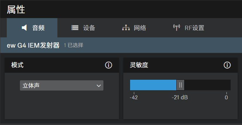 音频设置 您可以为包含Evolution Wireless G4和G3系列的接收器和发射器的无线通信线路调整以下设置。 模式 将发射器设置为立体声或单声道模式。 有关更多详细信息,请参阅ew 300 IEM G3或ew IEM G4使用说明书产品文档。 灵敏度 调整发射器的输入灵敏度。
