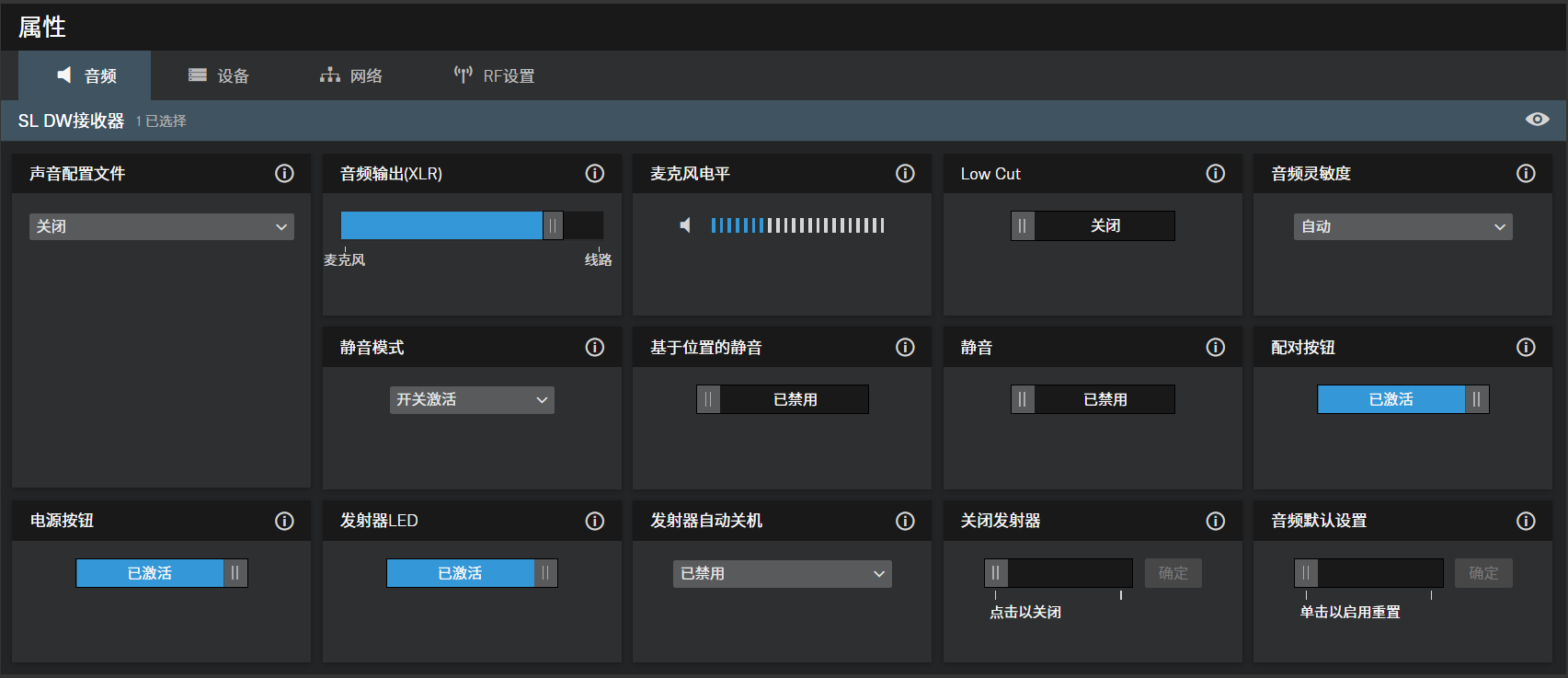 您可以在音频选项卡中为包含SL Rack Receiver DW的无线通信线路调整以下设置。