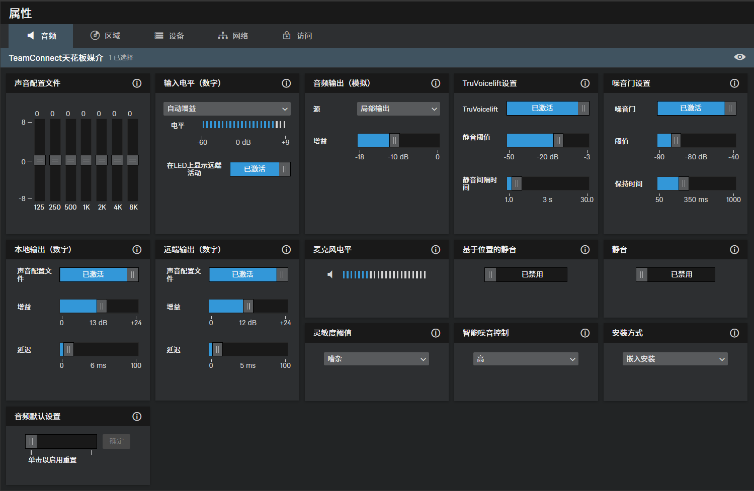 - 嵌入安装:如果天花式阵列麦克风安装在天花板中或天花板正下方,则推荐此设置。