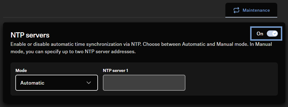 配置 NTP 服务器 启用 NTP 服务器或临时使用浏览器时间。 要配置 NTP(网络时间协议)服务器: 在设备的 Local Web UI 中,导航到 Maintenance 选项卡。 将 NTP servers 设置为 On。 启用后,系统默认使用由 DHCP 服务器提供的 NTP 服务器(“Automatic”)。 如果 DHCP 服务器未提供 NTP 服务器,或者您使用的是静态 IP 配置,请将 NTP servers 字段中的选项更改为 “Manual”,并输入您的 NTP 服务器。您可以输入 IP 地址或 DNS 名称。 在配置时间服务器时,设备会接受通过 DHCP 提供或手动输入的任何地址或名称,而不会验证其可达性或有效性。此功能允许预先配置设备,以便稍后在不同环境中使用。如果出现时间同步问题,请确保已配置的服务器可访问并且是有效的 NTP 服务器。 如果无法使用 NTP 服务器,您可以通过在系统时间字段中点击“Use browser time”,将设备时间设置为与浏览器时间一致。请注意,此时间仅在下次重新启动/断电前有效。若在未使用 NTP 的情况下重启后需要连接云端,必须再次手动设置时间。 NTP 服务器已配置。
