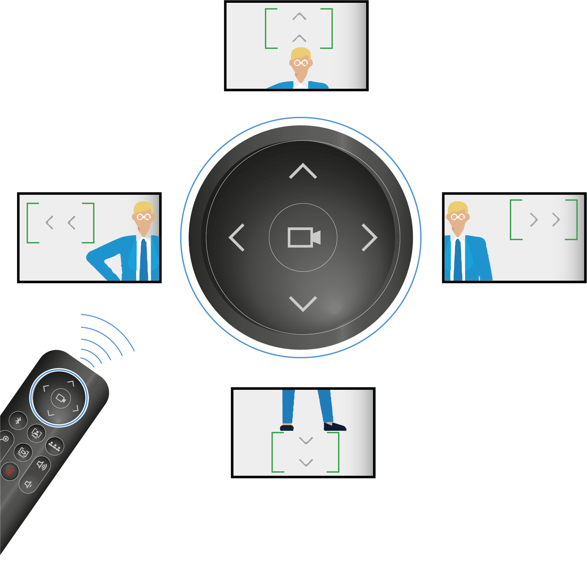 请注意,摄像头图像默认设置为完全缩小。为了手动改变位置,必须放大摄像头图像。另外,摄像头在一个模式中不得激活(参见 Auto Framing 或者 Person Tiling)。